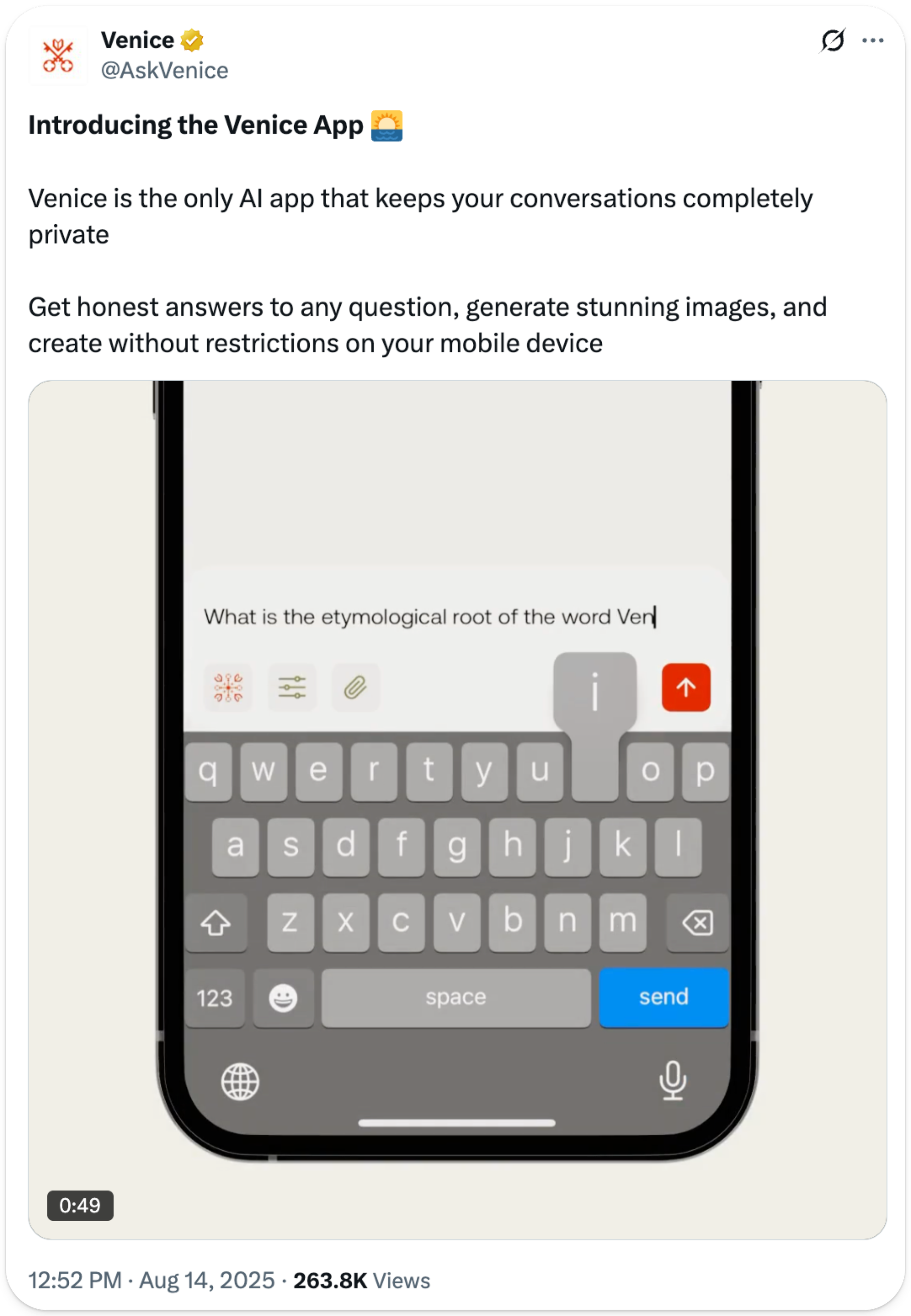 Launched by cryptocurrency entrepreneur Erik Voorhees in May 2024, Venice.AI is a chat-based platform for decentralized, private, and censorship-free access to leading generative AI models.