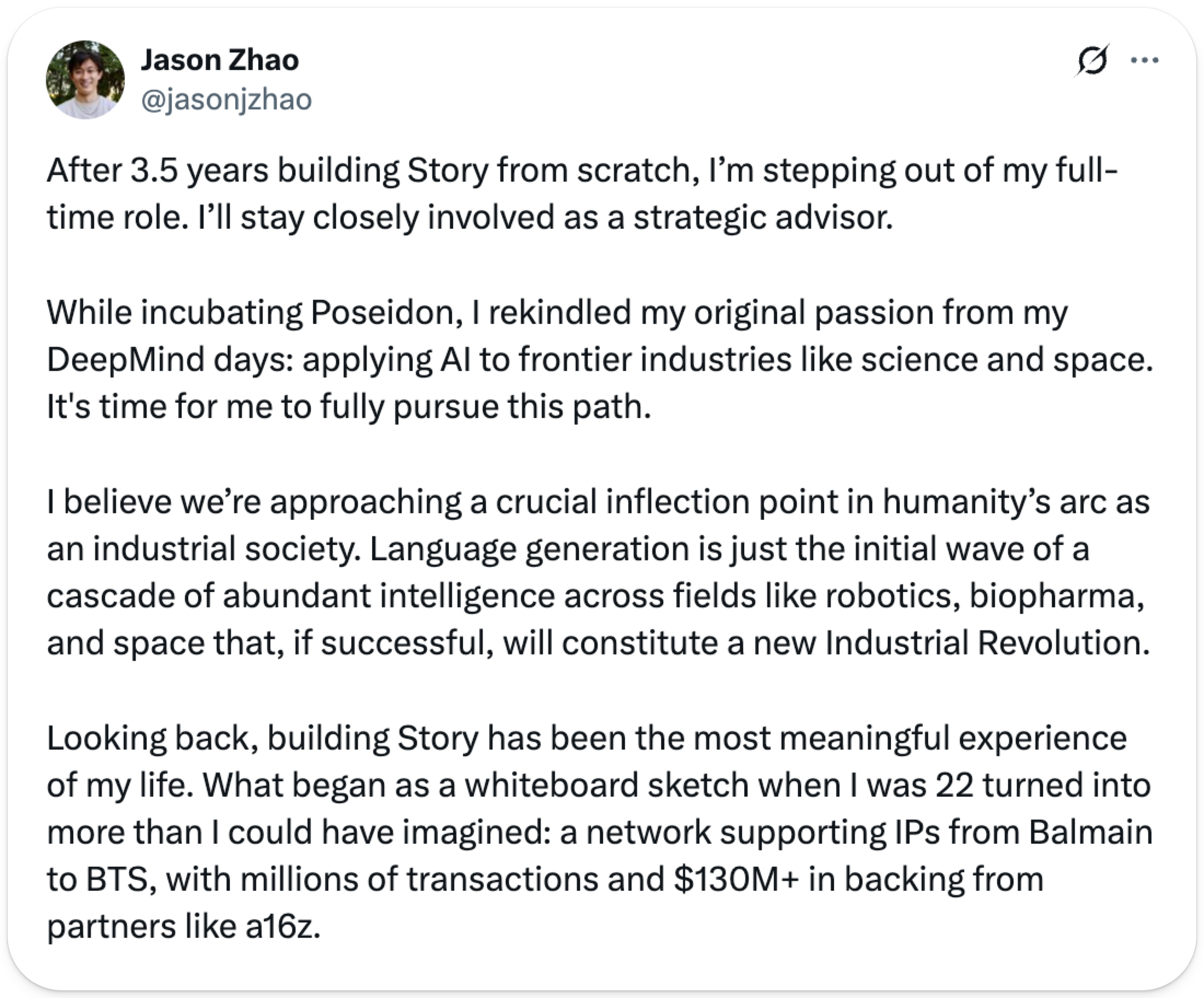 - Departing Founder: Story co-founder Jason Zhao has stepped down from his “active role" just six months after the launch of its IP token to pursue a new AI initiative. A move that earned the ire of Crypto Twitter for coming so soon after the token's launch.