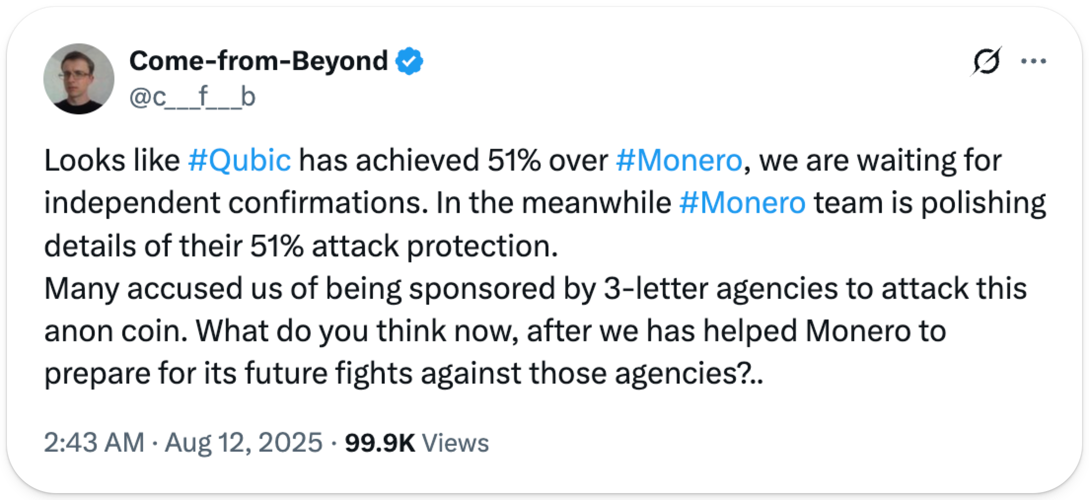 - Miner Attack: On August 11, rumors began circulating that Qubic (a blockchain created by IOTA co-founder Sergey Ivancheglo) had acquired majority 51% control over the Monero network after it successfully executed a six-block transaction reorganization.