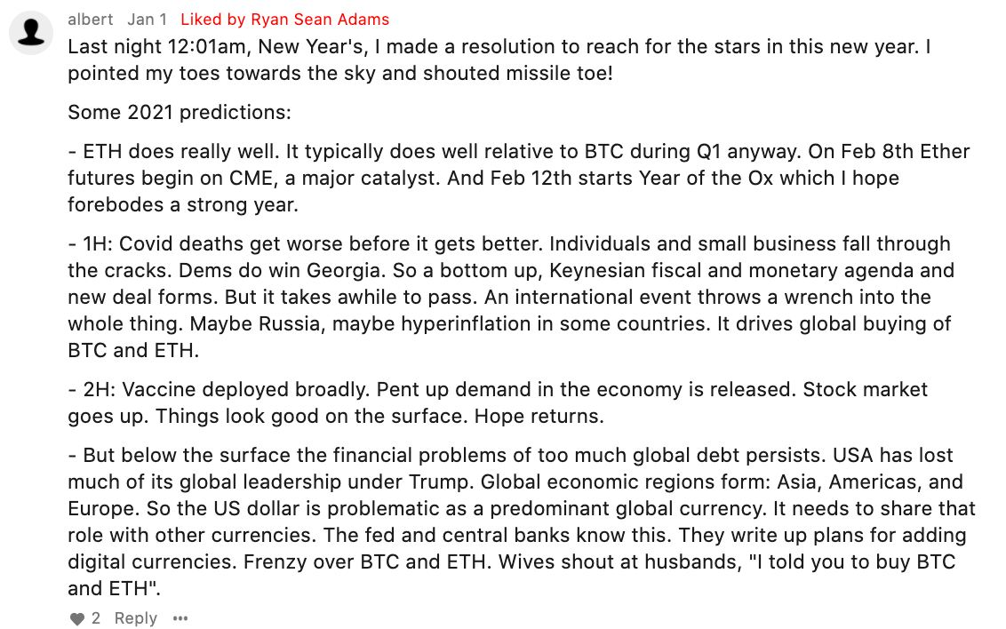 - The Internet Bond gets memed into existence. Institutional investors will watch the price ascent of Ethereum in wonder. Some will participate, then more will participate after ETH futures launch. As they do they’ll upgrade their narrative to rationalize their ETH bets. They’ll talk of staked ETH as an Internet Bond just as they talk of BTC as digital gold. Expect a Forbes or Bloomberg article using this meme. Maybe a Paul Tudor Jones type saying it on CNBC.