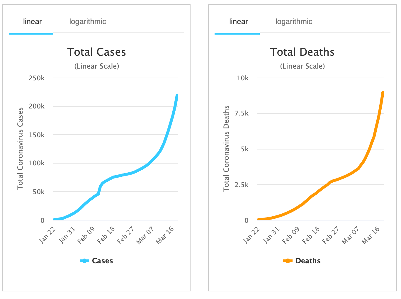 (Above) Total cases and total deaths from Coronavirus as of March 19th—exponential growth