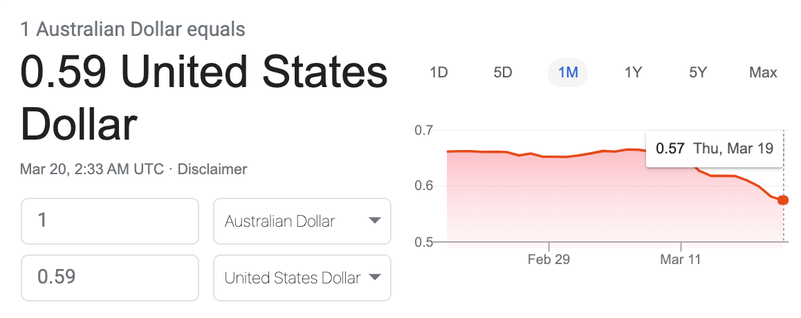 (Above) Australian dollars losing over 15% relative to U.S. dollars over the past several weeks