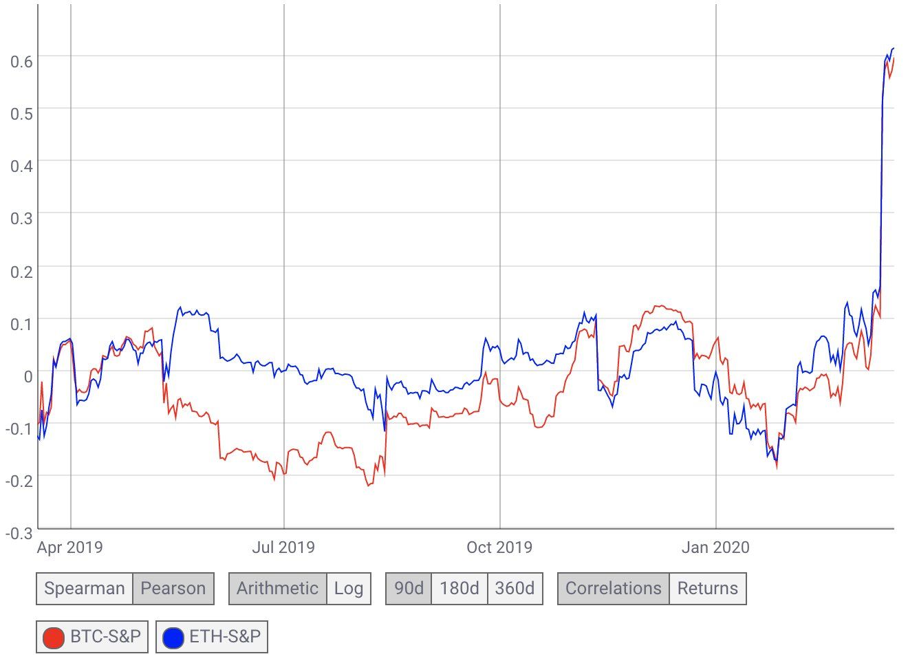 Crypto has shown recent correlation with stocks during this liquidity crisis phase. When stocks went down, so did crypto. The correlation between the two asset types has never been higher.