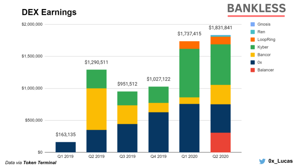 While DeFi incumbents remained at the top of the earnings leaderboards, Q2 saw an explosion of new entrants along with major protocol upgrades. While DeFi’s favorite liquidity protocol - Uniswap - launched V2 in May, we also saw new additions to the field including Balancer, Ren, Gnosis, and Loopring, all of which went live with major upgrades or new product launches, bringing in new interest to the protocols (as well as earnings).