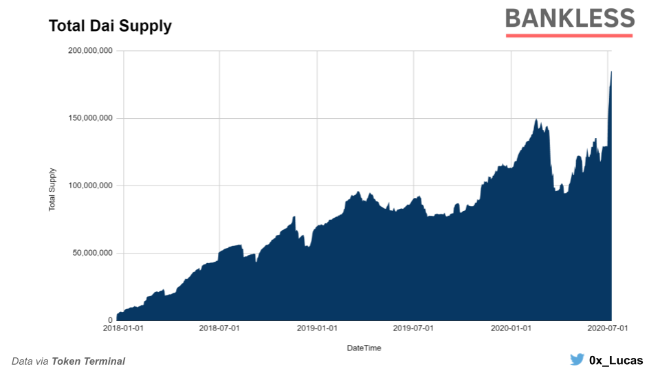 The silver lining with Maker’s 0% stability fee is that the outstanding supply of Dai is reaching new highs. In Q2 alone, Dai’s supply increased by 90% to 184.9M in circulation. The recent spike in supply ironically comes as Compound’s recent change to the COMP distribution resulted in a “crop rotation” in favor of Dai.