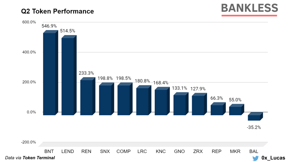 The best performing DeFi asset in the quarter was Bancor’s BNT as the token surged 546% following the announcement of the liquidity protocol’s V2 upgrade. The other notable performance in Q2 was Aave’s LEND which is having the strongest year out of any DeFi token to date. In Q2 alone, LEND rose by 514% while the money markets protocol simultaneously increased its value locked from $30M to over $120M by the end of June.