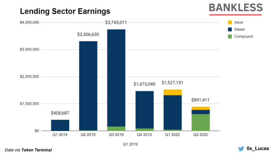 In Q2 2019, Maker effectively represented over 99% of earnings in the lending sector. Fast forward a year later and Maker’s 0% SF environment opened up the opportunity for new players.