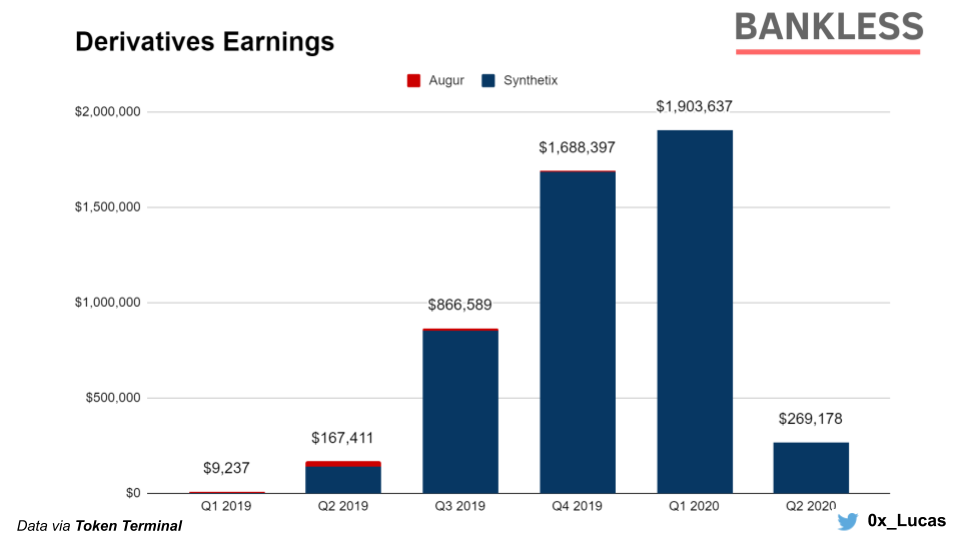 To date, Synthetix is still the only major player in the derivatives space. And while Synthetix was seemingly playing its role as the de-factor derivatives protocol (due to disproportionate earnings), the recent fix has brought down protocol revenues substantially.