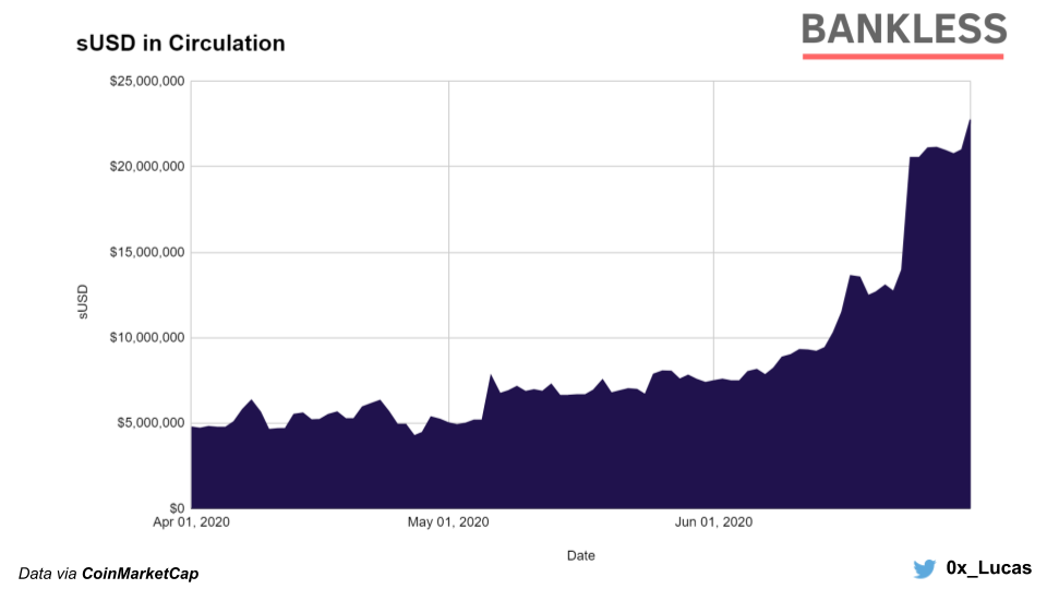 Equally as important, the amount of outstanding sUSD is hitting new ATHs as Synthetix’s native crypto dollar has increased its circulating supply by 379% in Q2 to reach $22.7M in total.