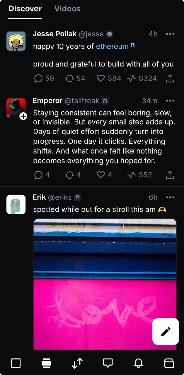 Then if you flick over to the next button at the bottom of the app, which looks like a rectangle sandwiched between two short lines, you'll find Base's new in-app social feed that's built atop Farcaster: