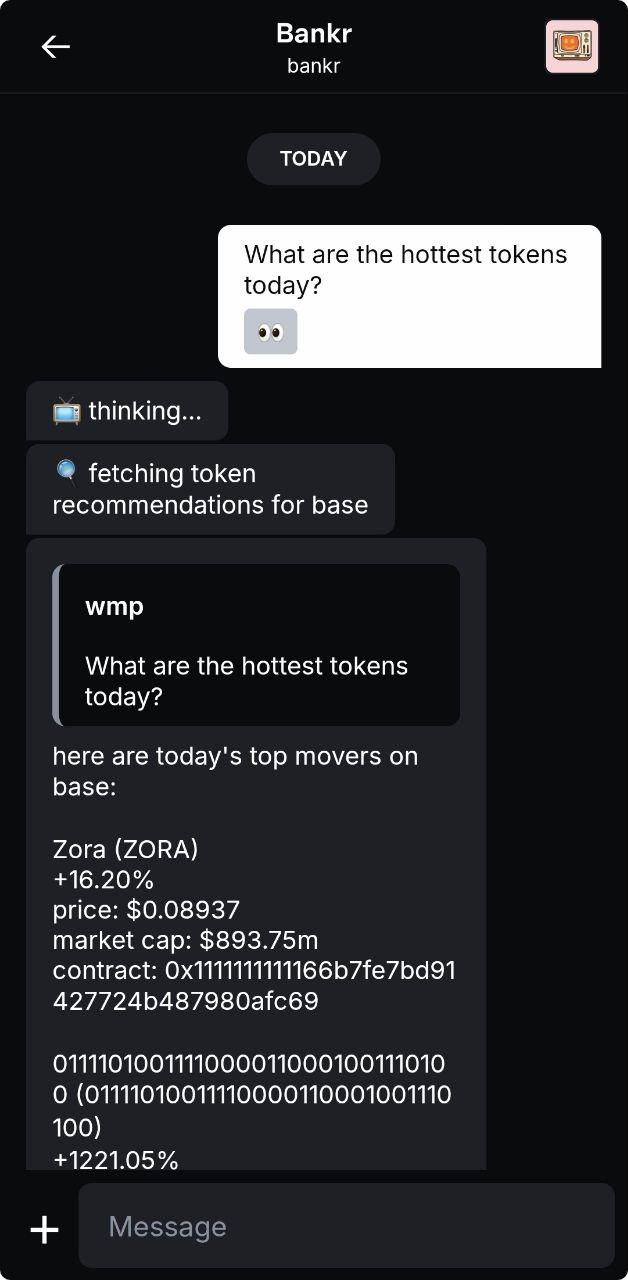The next navigation button is the chat box, which brings up the Base app's Chat hub. This is where you can direct message people you follow or onchain AI assistants like Bankr and Mamo.