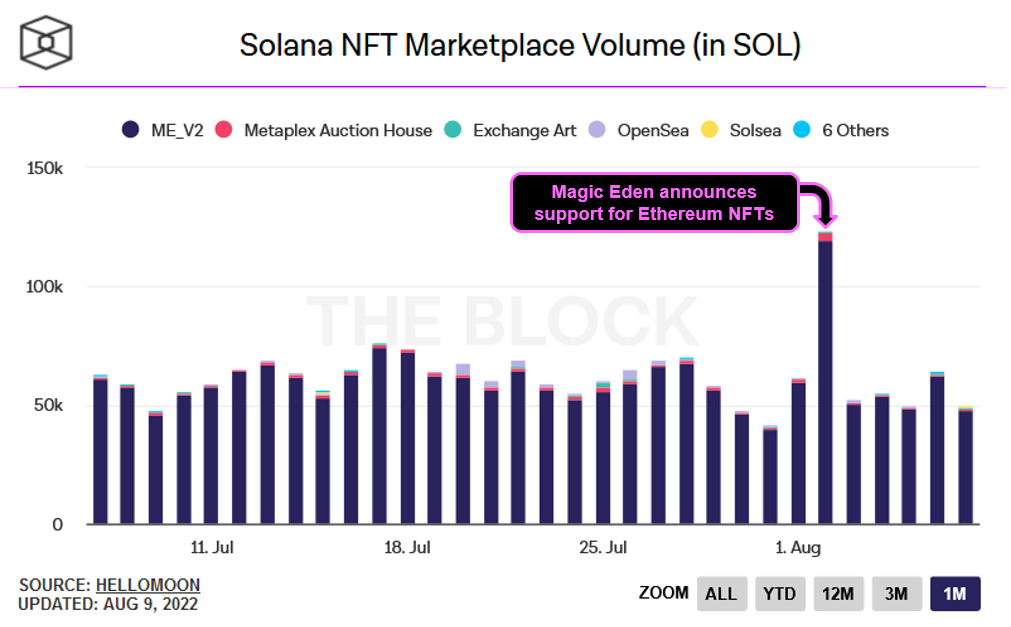 Why this matters: Sales jumps after Magic Eden launches Ethereum NFTs, indicating stiffer competition to come for Opensea as the de facto NFT marketplace.