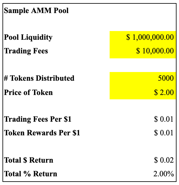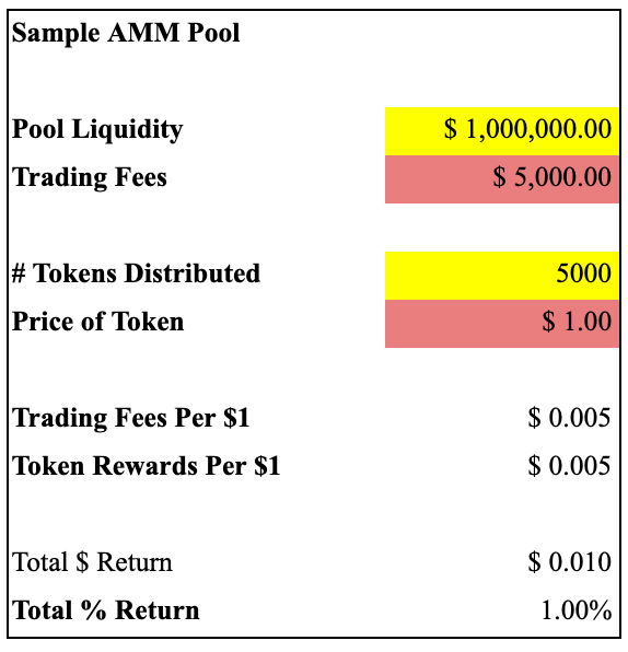 In this new scenario, while the liquidity of the pool remained the same, trading fees decreased 50% to $5000. Furthermore, although the distribution rate did not change, the price of the token being rewarded declined 50% as well to $1. As a result, a strategy that was once earning a liquidity provider 2% is now only yielding them 1%.
