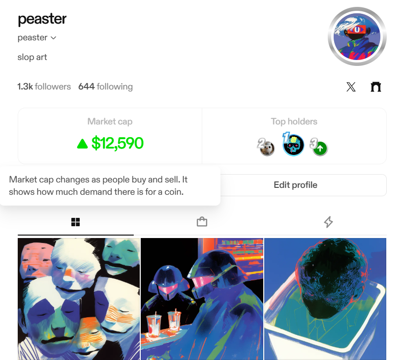 For example, now whenever I post on Zora, the content gets coined and put into a liquidity pool with my profile coin, $peaster. If I consistently post stuff (so more pools) that some people like (thus more buys), my profile's market cap will trend up.