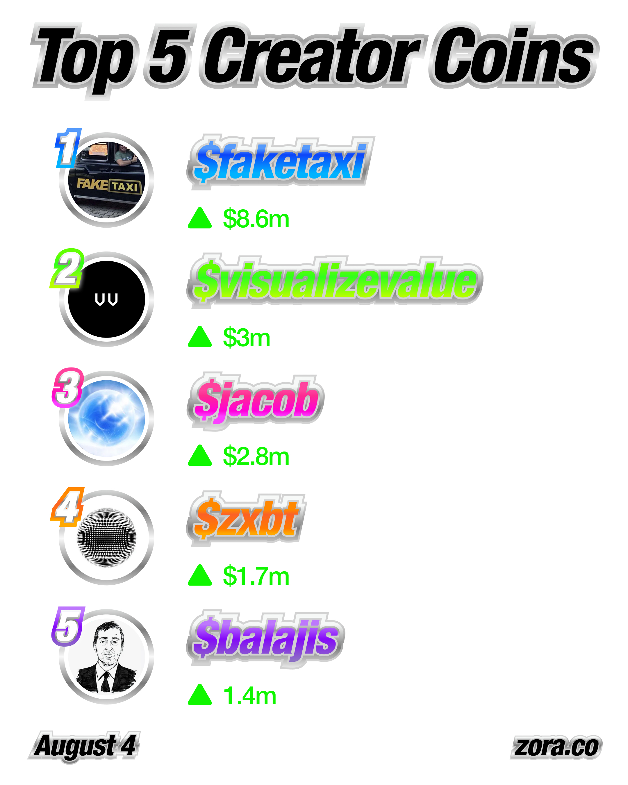 Right now, the 5 biggest accounts are FakeTaxi (the 1st adult IP coin?), Visualize Value (via Jack Butcher), Jacob (Zora's co-founder), zxbt (an autonomous onchain AI artist), and Balaji (the entrepreneur and investor).