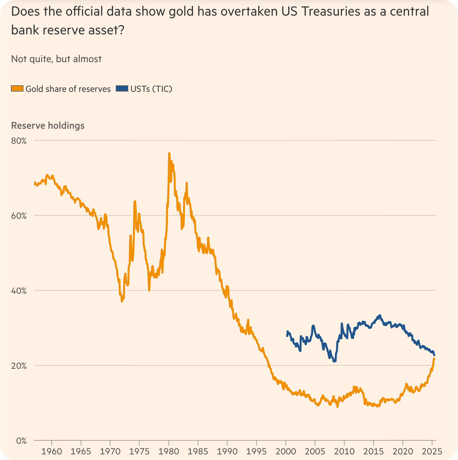 As I covered last week, central banks are quietly exiting the Treasury-reserve era and reallocating into hard assets like gold. Regardless of whether foreign holdings of gold have indeed surpassed U.S. Treasuries or not, what’s clear is that there’s been a tectonic shift in how the world stores value.