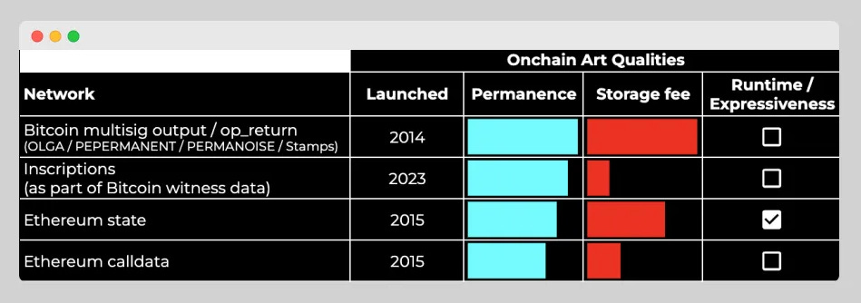 As such, while Ordinals may offer the best permanence-to-cost ratio for NFTs in crypto today (it’s possible to get onchain NFTs on Ethereum, but they’re comparatively more expensive to build than Ordinals), the Stamps system currently appears to offer the best straightforward permanence guarantees here.