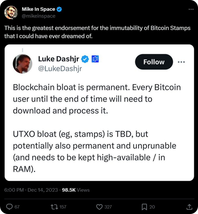 This design contrast leads to subtle, but notable, tradeoffs here. Namely, the UTXO method of Stamps makes them unpruneable and thus seemingly permanent, though they’re more expensive to create than an Ordinals-style mint. Conversely, the way Ordinals use witness data ultimately makes them pruneable—however unlikely—yet they’re more affordable to make than Stamps.