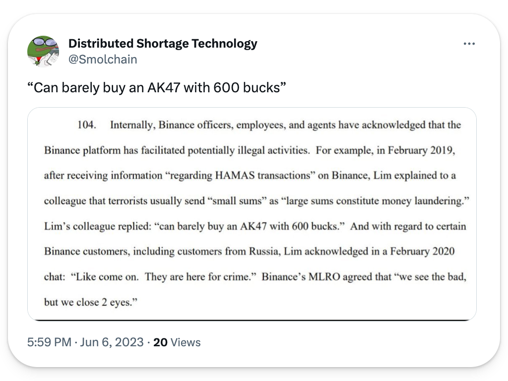 While the prevalence of crypto-financed terrorism has been grossly overstated, this is not the first time that the topic of Hamas has come up for Binance. In the CFTC's lawsuit against Binance earlier this summer, the agency disclosed that Binance had become aware of Hamas's usage of the platform but that it had been largely shrugged off.
