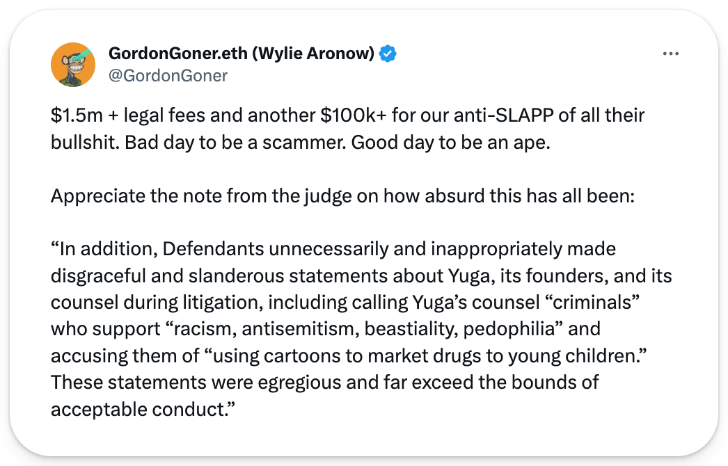 The judge awarded Yuga more than $1.5 million in damages and has given them control over the infringing assets, including the copycat project's smart contract.