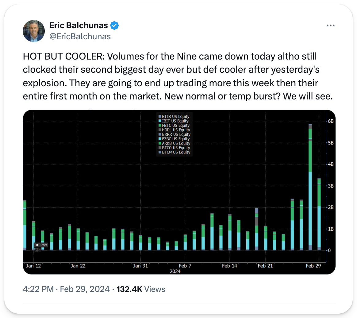 Bitcoin ETF inflows and volume contributed greatly to BTC’s price action, with Wednesday marking a new peak for inflows with $673M across the funds. As of Friday, Blackrock’s IBIT ETF had hit $10B in volumes. Whether or not a pullback proves imminent is beside the point; we are going so much higher.