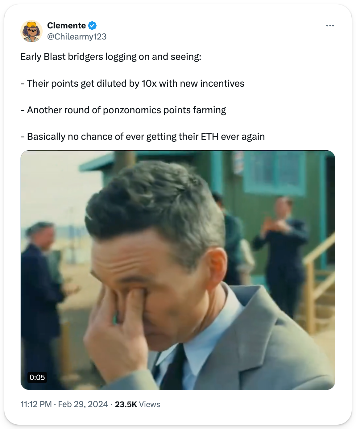 As expected, Blast's launch started with a bang, reeling in 502k transactions from 18.8k wallets in just under an hour post-official launch, though degens had already unofficially bridged to the network hours before.