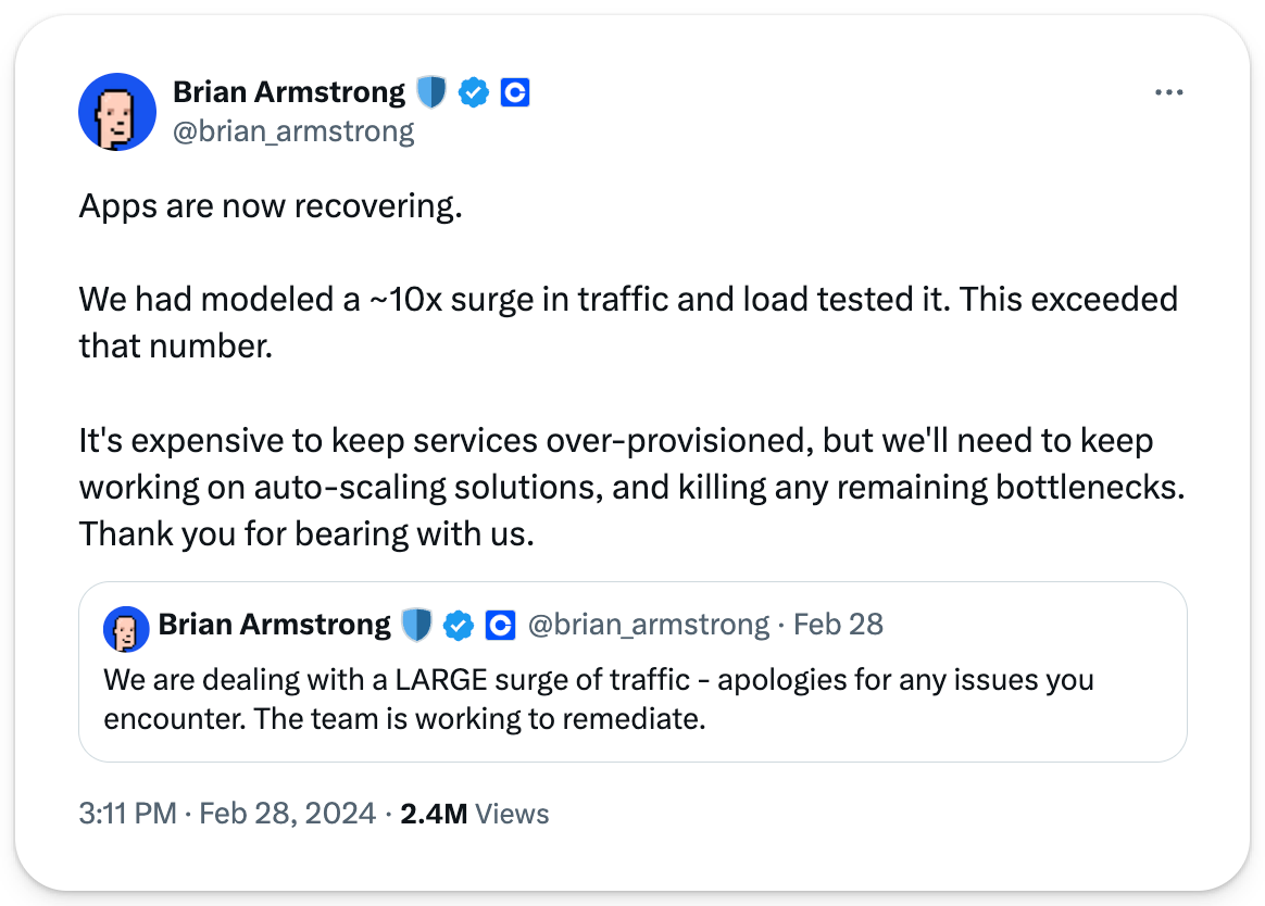 Bitcoin's surge caused Coinbase's first outage since May 2020 amid a 10x volume spike. An odd glitch accompanied this outage, making many account balances mistakenly read zero. Service has since been restored with CEO Brian Armstrong acknowledging the need for improved scaling function to accommodate such surges.