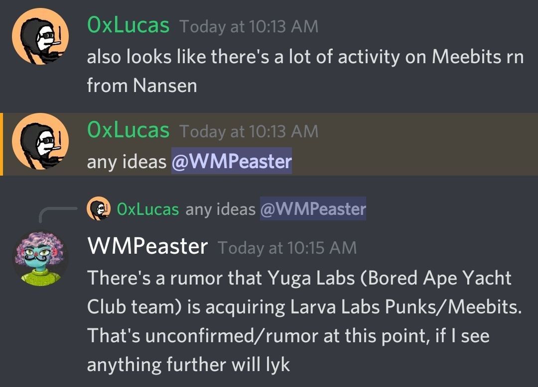 One thing that’s raised eyebrows is how Meebits trade volume boomed in the lead up to Yuga Labs’s acquisition news. I had personally heard and seen rumors of the deal beforehand, so in retrospect the news was definitely out there, though the extent of which remains unclear.