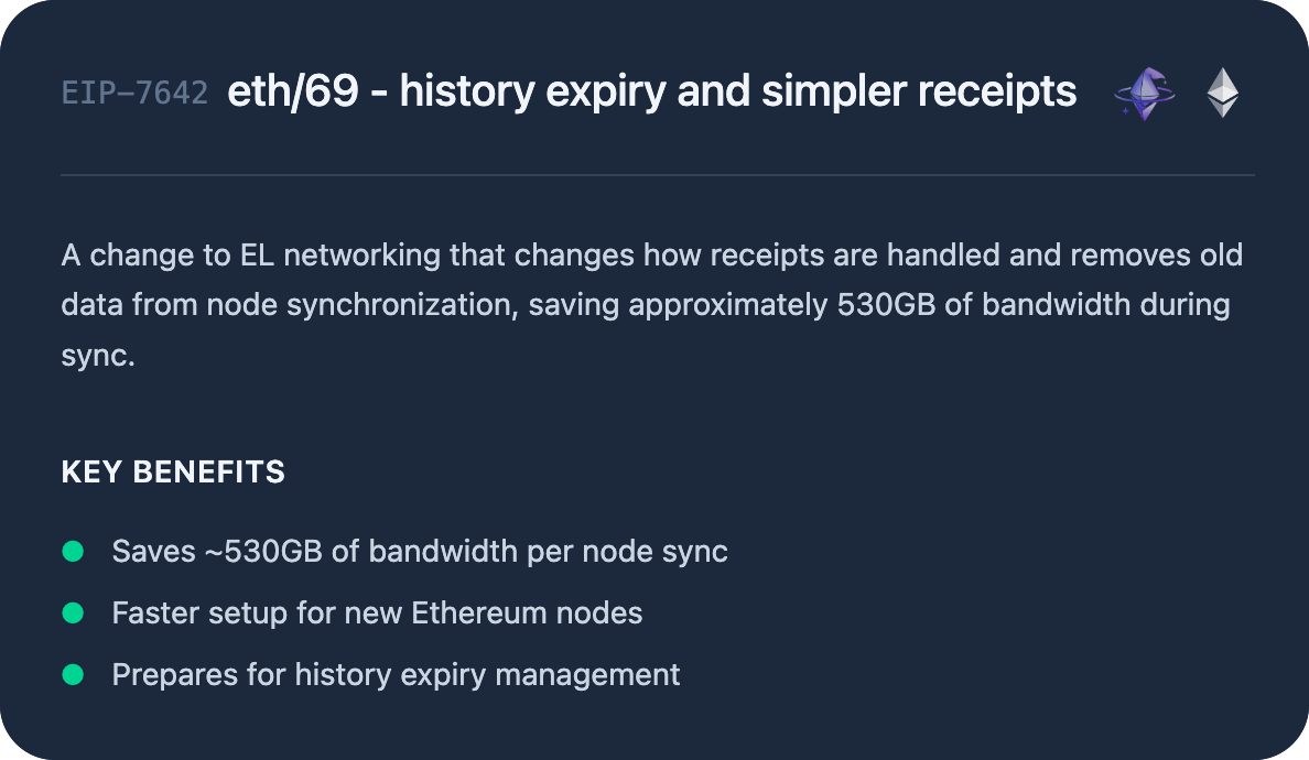 With PeerDAS dramatically cutting data requirements, full nodes will store only 1/8th of blob data, slashing bandwidth by roughly 80%. Solo stakers will see around 50% reduction in the bandwidth they need to download network data, though the bandwidth they need to upload network data will increase 2-3x initially (rising to 5x as blob counts grow over time). History expiry (EIP-7642) drops old pre-Merge data, further reducing disk space for new operators.