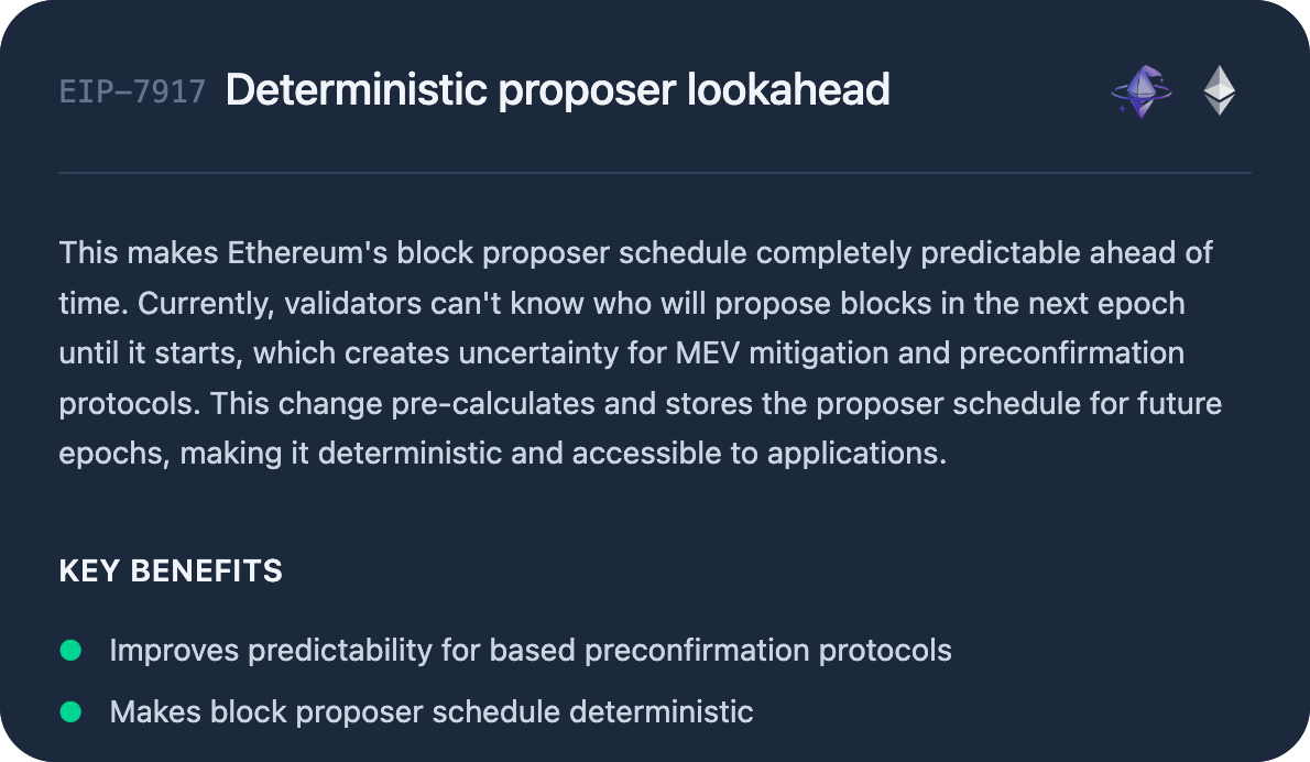 Deterministic proposer lookahead (EIP-7917) makes the block schedule completely predictable, enabling based preconfirmations — commitments from upcoming proposers that guarantee transactions will land before blocks are produced. Instead of always waiting 12+ seconds for confirmation, users could see instant feedback — a timely upgrade as the perpetuals landscape keeps heating up, and also useful in cases like gaming.