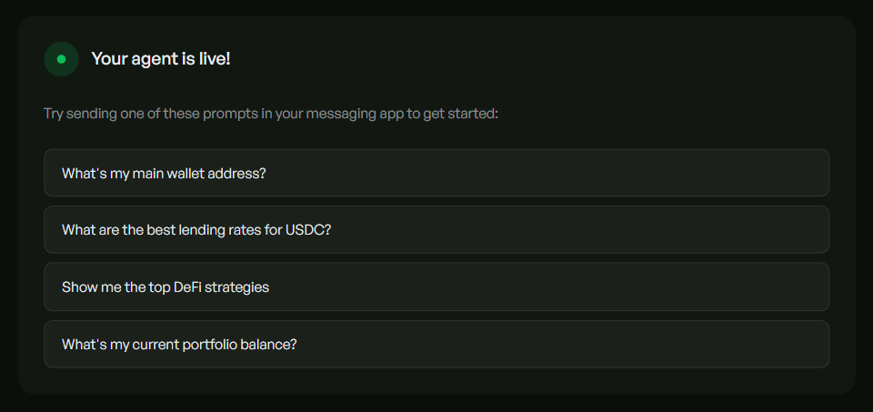 After you're finished setting up, you can start prompting your agent to take onchain actions for you.