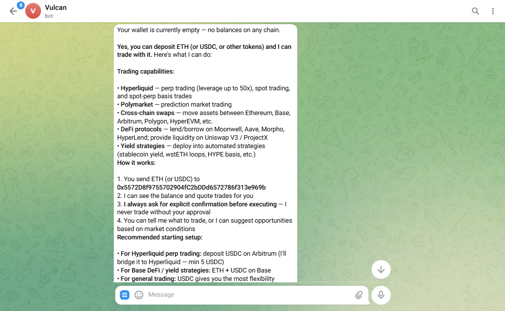If you're stumped about what to do at this point, you can also just ask your agent for ideas. It can do market analyses, borrows, lending, LPing, predictions, perps, and more. Pretty slick!