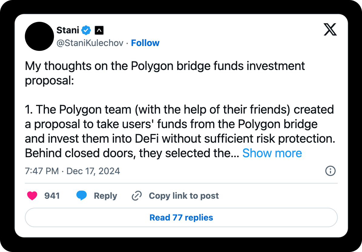 Polygon ran aground this week after significant pushback from its community over a controversial proposal to deploy $1.3B in stablecoins from chain bridge funds into curated lending pools. Critics cited security risks and a lack of opt-in mechanisms for impacted users.