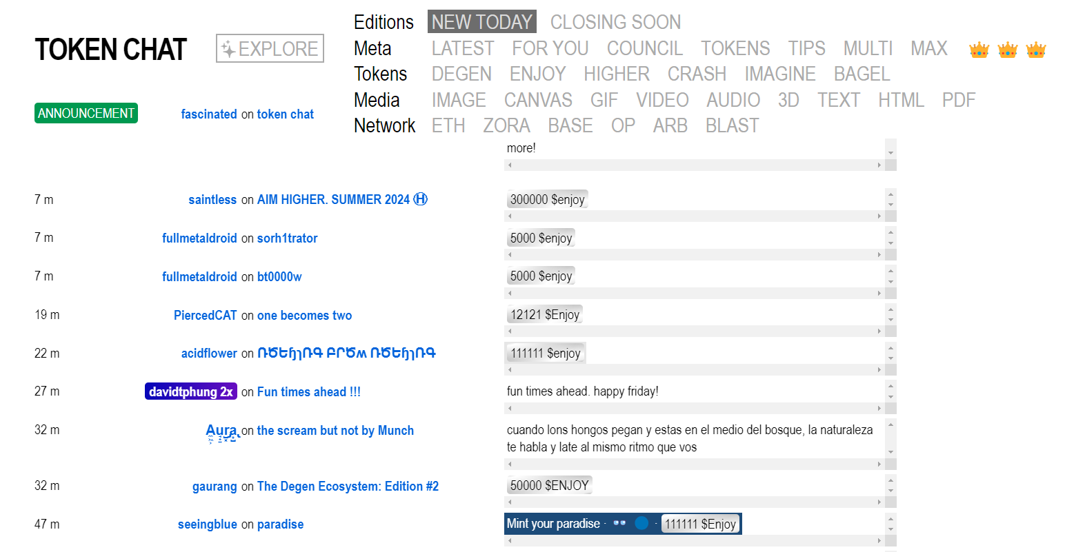The Enjoy project distributes weekly tipping balances of $ENJOY, which people distribute via comments on Zora mints.