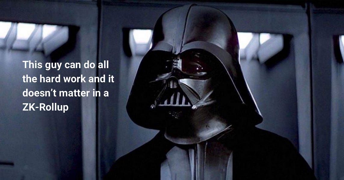 In more detail, the ZK-Rollup scalability solution is based on having a big computation—or a big batch of small computations—performed off-chain, where resources are plentiful. A proof of its validity is computed, and sent to the blockchain (alongside a commitment to the new state of the systems), where it is verified by a verifier smart contract. Network participants can then be satisfied that this computation is valid without adding any trust assumptions. It is the absence of these trust assumptions that would allow us to accept a valid proof, even if produced by Darth Vader & Sons.