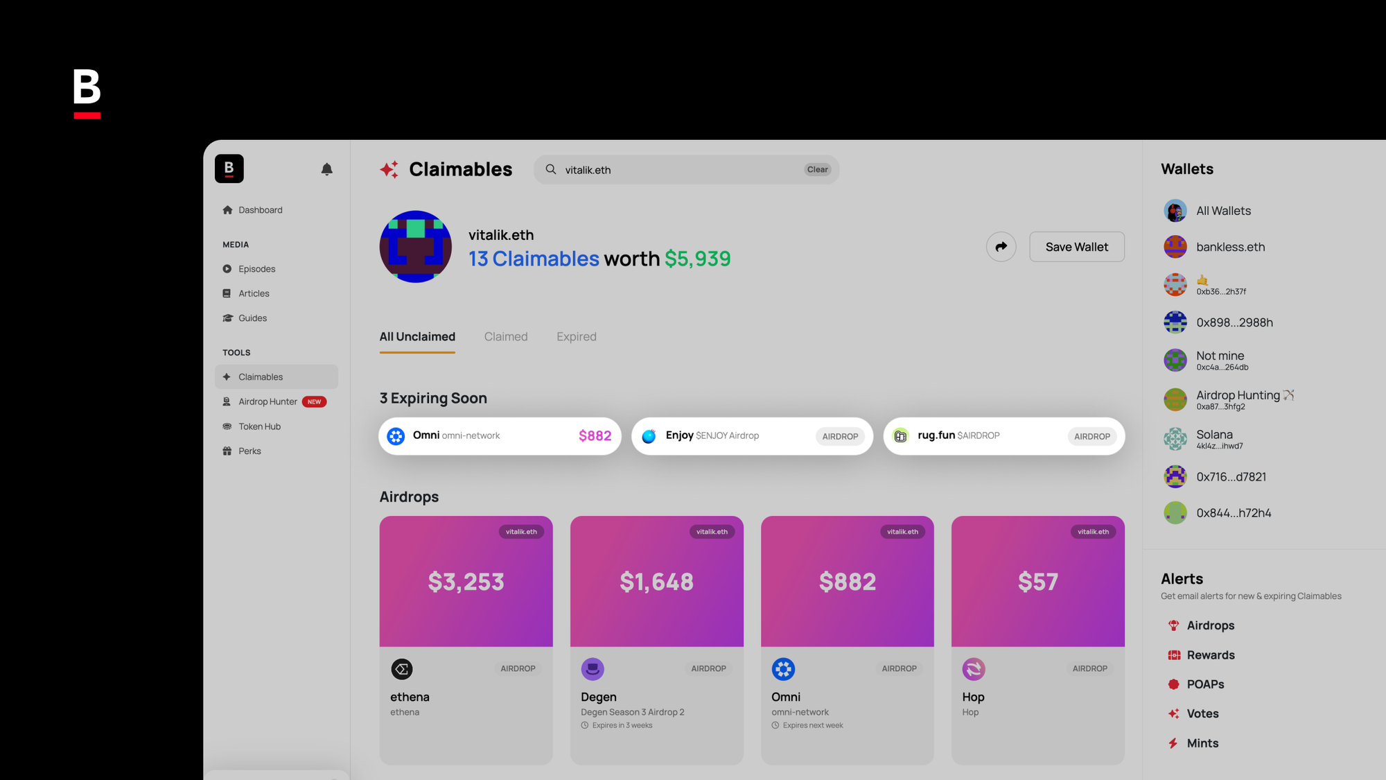 Before this release there was no easy way to search a new wallet before saving it to your account. You can now search any wallet or ENS for Claimables, before easily adding to your account and start getting alerts for new and expiring assets.