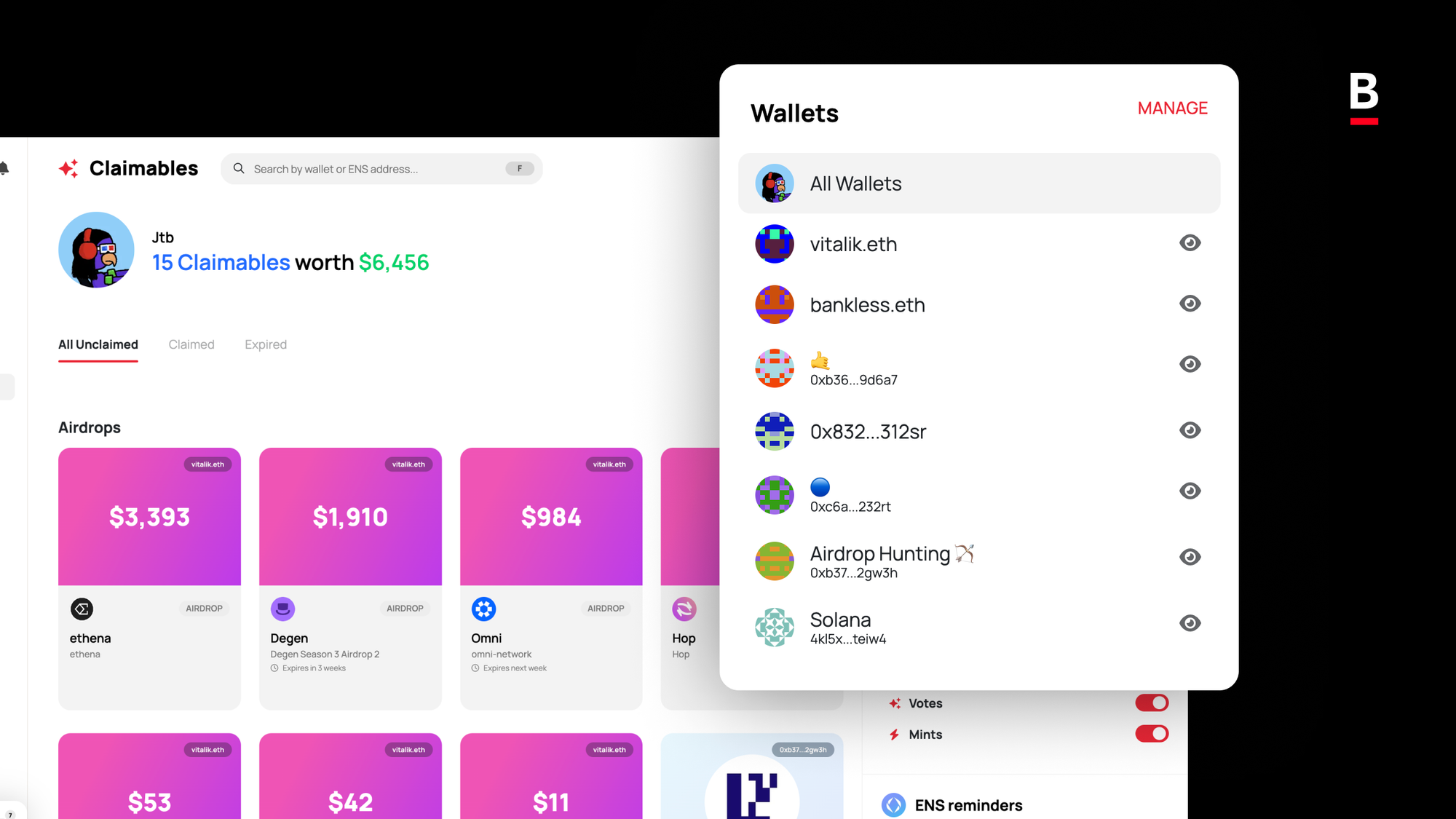 - You can easily hide any wallet from displaying in Claimables to customize your view or exclude watched wallets.