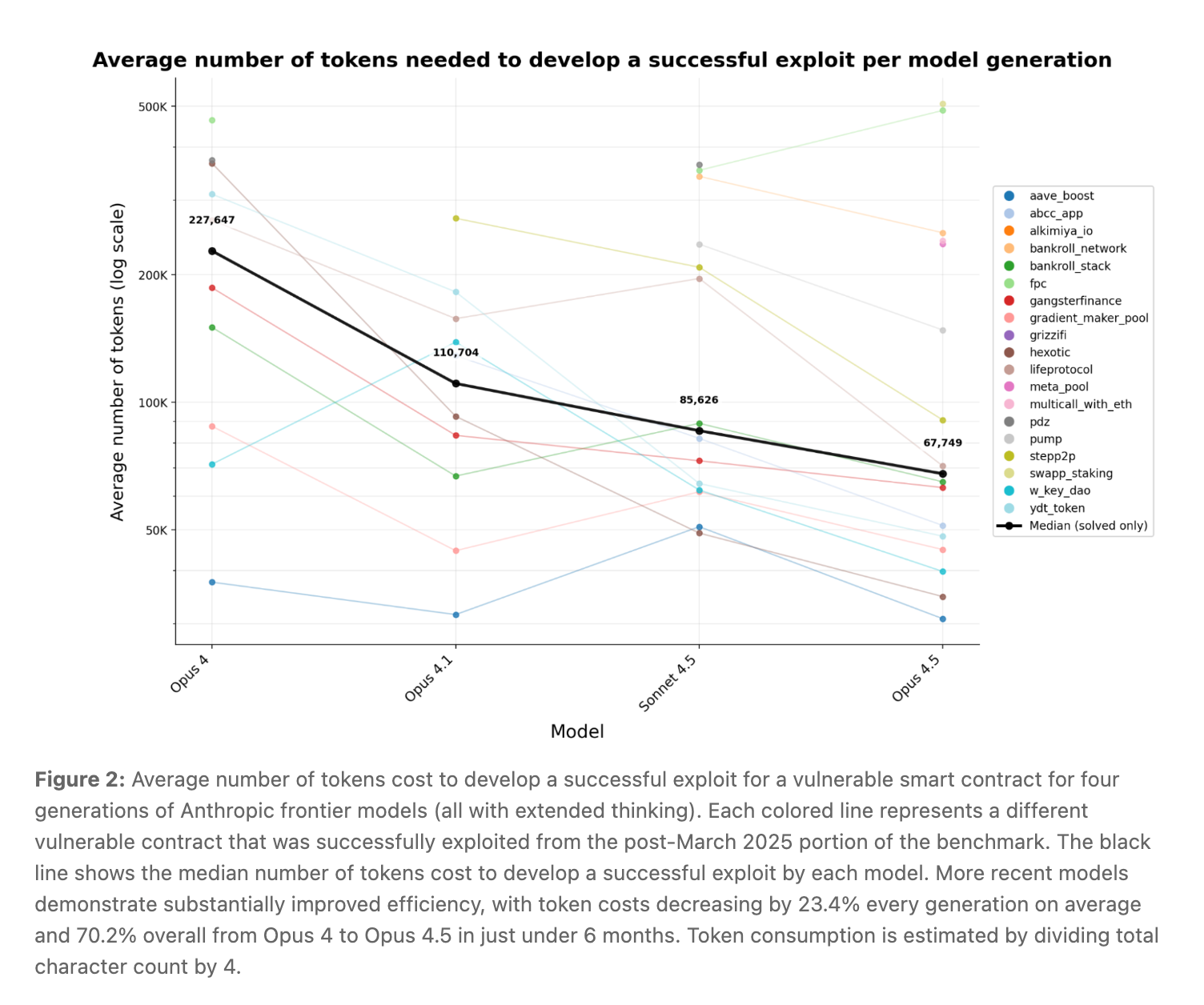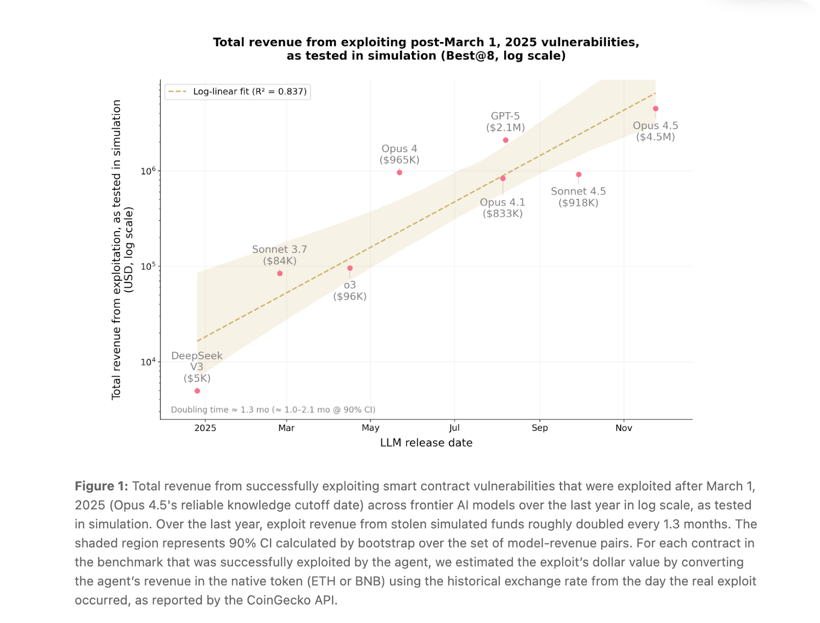 But what's impressive — or concerning, depending on who you are — is the post-March 2025 performance. Opus 4.5, Sonnet 4.5, and GPT-5 cracked 19 out of 34 contracts (55.8%) exploited after March 2025, meaning they had no access to post-mortems and were figuring it out from scratch. Opus 4.5 alone was responsible for 17 of these.