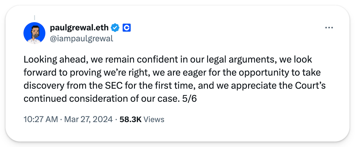 Despite Crypto's hopes and expectations that the SEC's case would get tossed, Coinbase's legal battle with the SEC will instead continue following a court decision that allowed most claims to proceed while dismissing those against Coinbase Wallet — a big win for self-custodial wallets. Ever the optimists, the exchange sees this as a way to gain insights into the SEC's stance on crypto regulation. Their Chief Legal Officer, Paul Grewal, stated they stand ready to continue the proceedings while emphasizing the importance of developing clear digital asset legislation in the US.