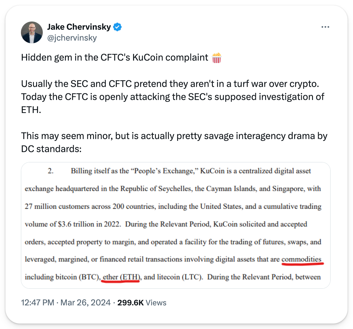Last Tuesday, the Department of Justice charged offshore exchange KuCoin’s founders with violating anti-money laundering laws and concealing that they had many US customers. For years, KuCoin operated without KYC requirements, adopting them only after coming under federal investigation. After the DOJ announcement, KuCoin users experienced substantial delays in withdrawing from the exchange — an inconvenience KuCoin decided to compensate users for with an airdrop announcement the next day for those who had delays. Amid this news, an interesting easter egg came from the complaint document, which defined Ethereum as a commodity in their suit — potentially weakening the SEC’s case.