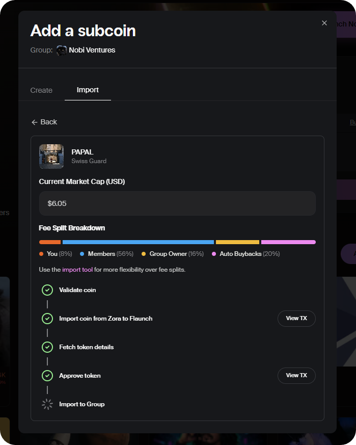 The Flaunch imports + Flaunch Groups combo offers some interesting consolidation and collaboration possibilities to onchain creatives, community managers, DAOs, etc.