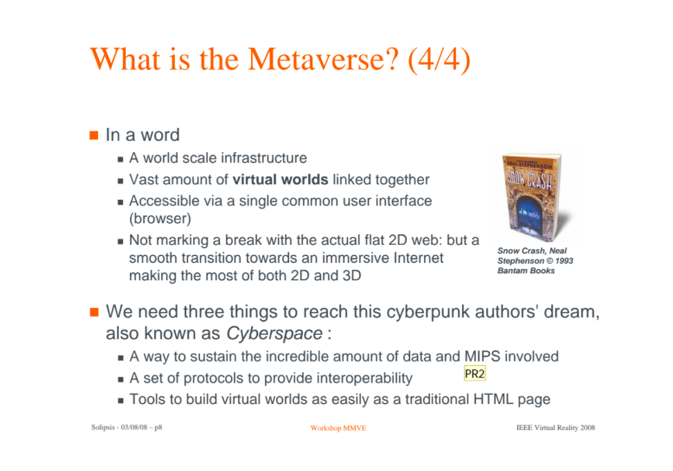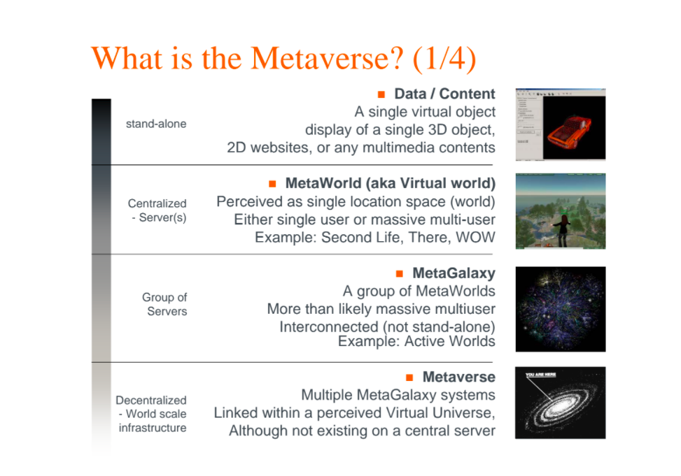 I eventually stumbled back to the original thread and found a presentation titled “Solipsis: A Decentralized Architecture for Virtual Environments.” Prepared by a group of researchers back in 2008, the introductory section (drafted by metaverse pioneer Will Burns) offers a most insightful framing of the metaverse, namely that it’s fundamentally composed of content, metaworlds, and metagalaxies.