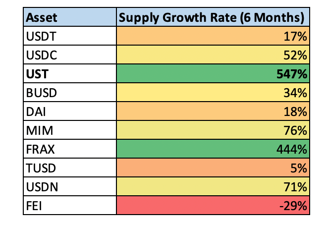 As we can see, UST has had far and away the highest growth rates among the ten, having seen its supply increase 547%. It’s one of just two, with the other being FRAX, that expanded at a greater than triple-digit rate over the period.
