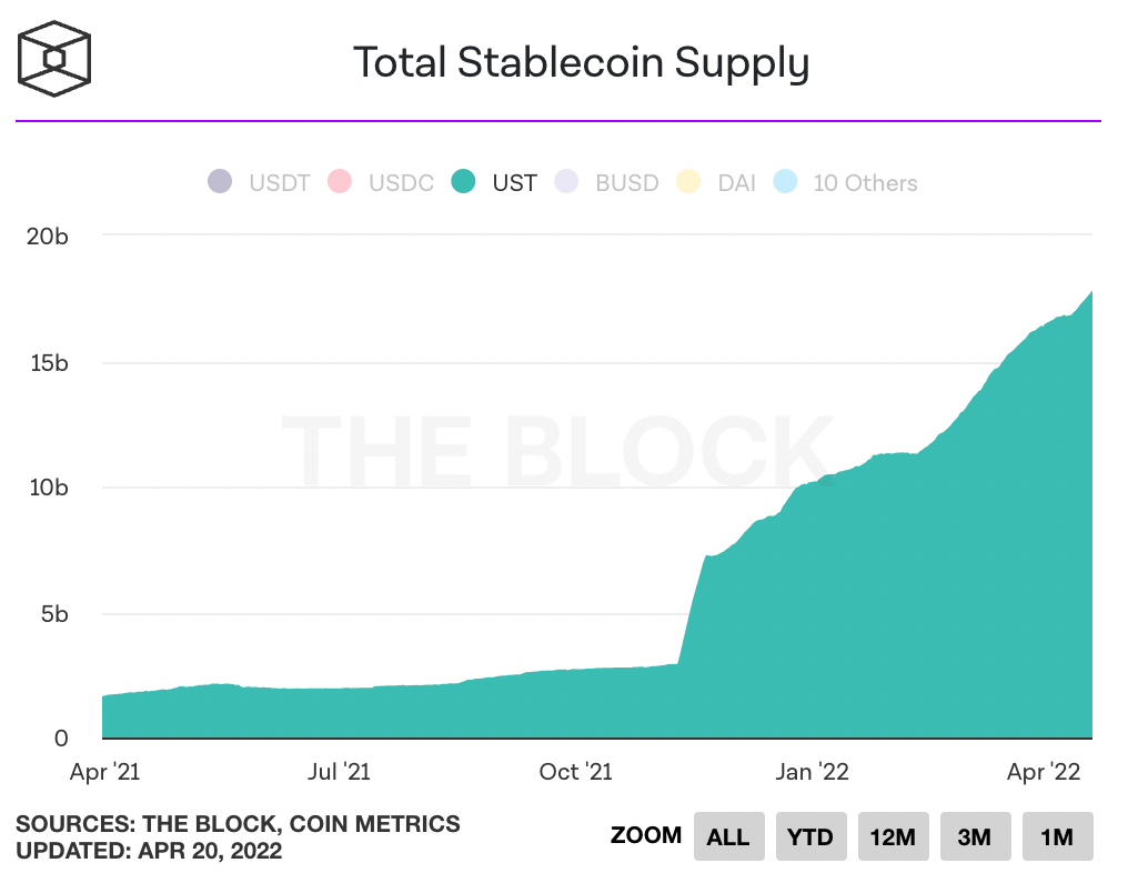 UST has experienced incredibly explosive growth during the past year, having grown more than 987% over the period to a circulating supply of more than $17.7 billion.