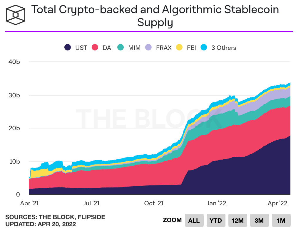 This impressive growth in market share is only highlighted by UST’s competitive positioning relative to other decentralized stablecoins. Per The Block, UST accounts for a majority of the decentralized stablecoin supply, with a 52.7% share of the $33.6 billion among the eight largest crypto-backed and algorithmic stablecoins. This represents a more than 2x increase from its 19.9% share in October 2021.