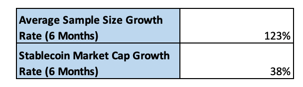 The table above shows the supply growth rates of the ten largest stablecoins by market cap over the past two quarters, including a mix of centralized, decentralized, fiat backed, crypto-collateralized, and algorithmic USD-pegged assets.