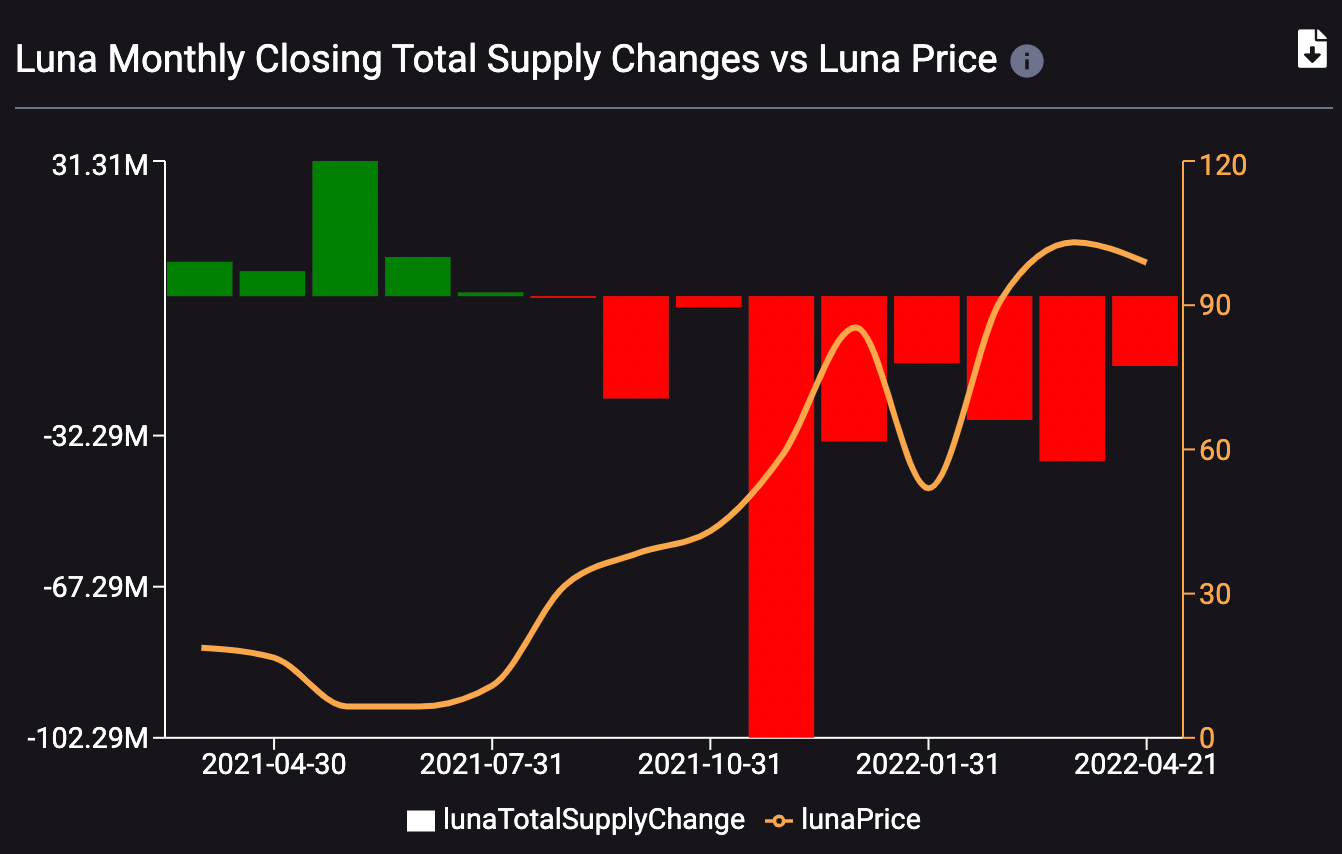 While this mechanism is highly reflexive, it places LUNA as a pure bet on the growth of UST, and has led to nine straight months in which the asset has been deflationary.
