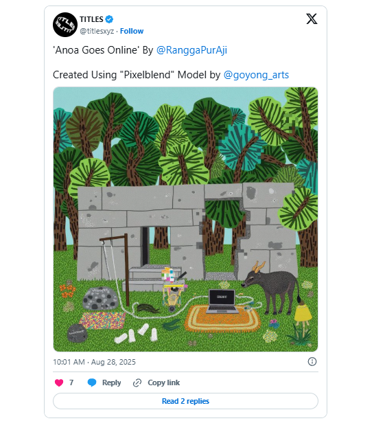 - TITLES is another option. It's an onchain AI remixing app that lets you simply mint outputs from custom-trained, community-sourced AI art models. I have one there you can try.
