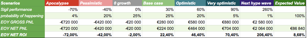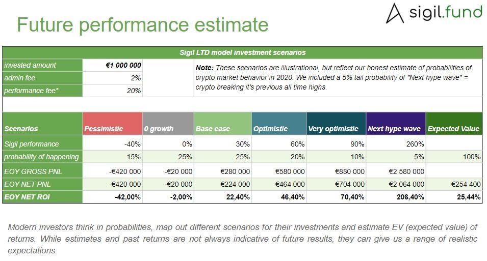 This estimate was created in December 2019, before we knew anything about the pandemics that will hit us. We estimated the EV of our investment fund, taking into account a range of scenarios and assigning probabilities to them. This should give us realistic enough expectations, given that our estimated errors average out in theory (see Fermi estimate).