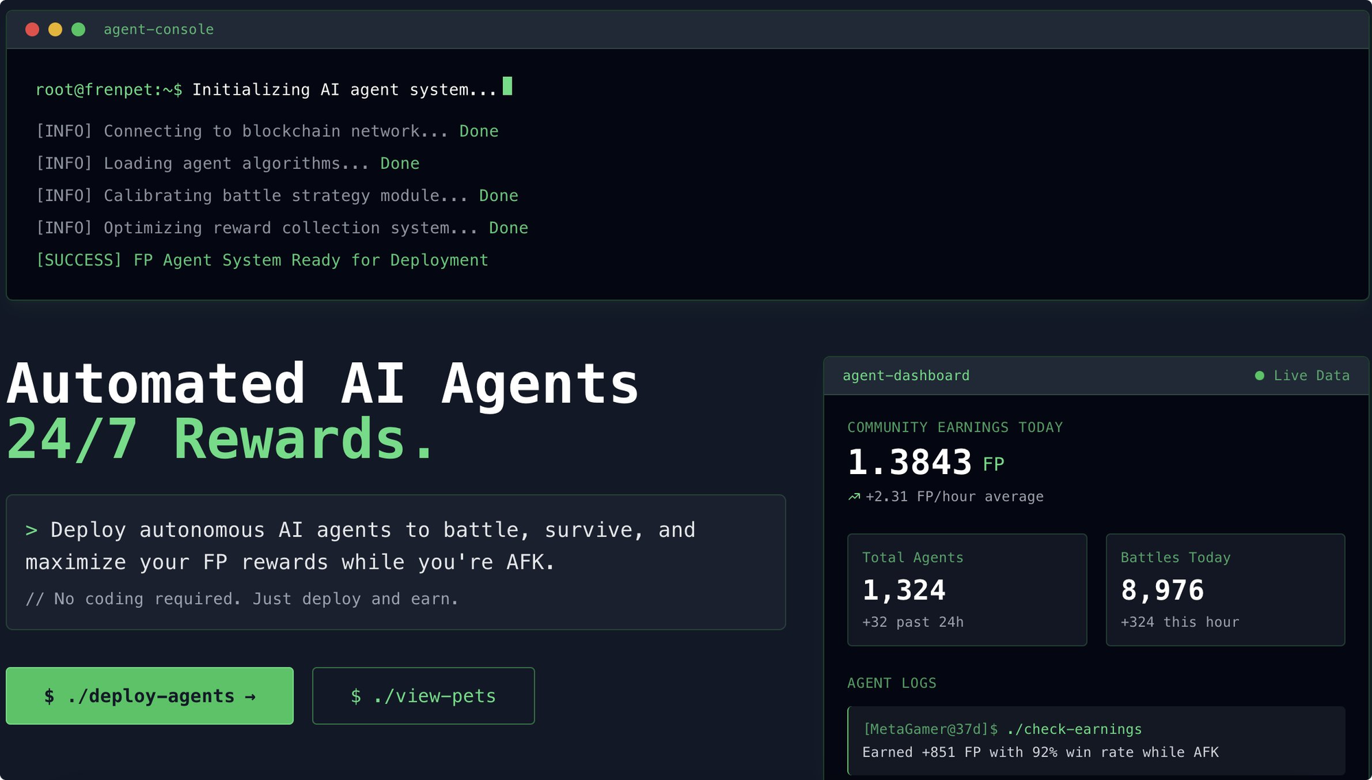 This no-code system will let you simply deploy AI agents that autonomously manage your pets and optimize your $FP rewards for as long as you have them active. Right now, there are no easy, one-click AI integration parallels in mainstream gaming. In onchain gaming, devs can readily overlay agent systems atop their games like this because onchain is "always on," and not siloed, and not shy to players earning real value.